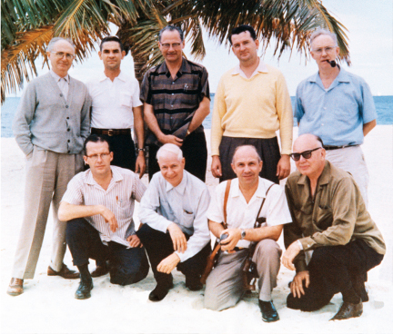 The Foundation’s 1957 conference. Back row: Henry Freund, M.D; Harold Luper, Ph.D.; Wendell Johnson, Ph.D.; Joseph Sheehan, Ph.D.; Charles Van Riper, Ph.D.; Front row: Dean Williams, Ph.D.; Malcolm Fraser; Stanley Ainsworth, Ph.D., Robert West, Ph.D. |
