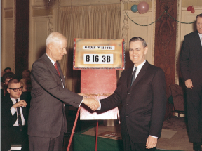 Malcolm Fraser congratulating Gene White, who for many years refused all compensation for his work on behalf of the Stuttering Foundation. |