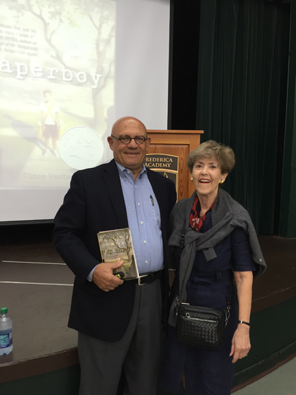 St. Simons Island, GA (Sept. 14, 2016) — Stuttering Foundation President Jane Fraser had the honor of introducing author Vince Vawter at an assembly at Frederica Academy, St. Simons Island, Ga., today for a presentation about his book Paperboy.