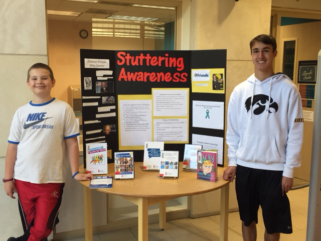 Caleb and Pete are currently preparing to take public awareness displays during National Stuttering Awareness Week into two local libraries. Caleb is getting ready to transition to a new school building as a 6th grader and is ready to share his video about stuttering with his new teachers. Caleb also wants to pay it forward by demonstrating a positive mindset to a new 7-year-old I now have on my caseload.