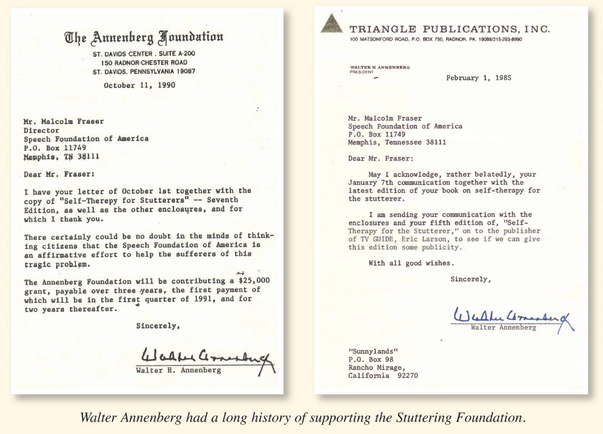 Annenberg’s Oct. 2, 2002, obituary in the New York Times stated that he struggled with stuttering throughout his life. In a 1982 book by John Cooney, the author writes, “By 1968, it is impossible to equate the coolly self-confident tycoon, who gives orders as naturally as he breathes, with the shy, stuttering child he once was or the carefree young man-about-town ...” Another passage describes his childhood. “Walter was a shy boy, a major reason being a terrible stutter. Simple words and phrases took him forever to say.”