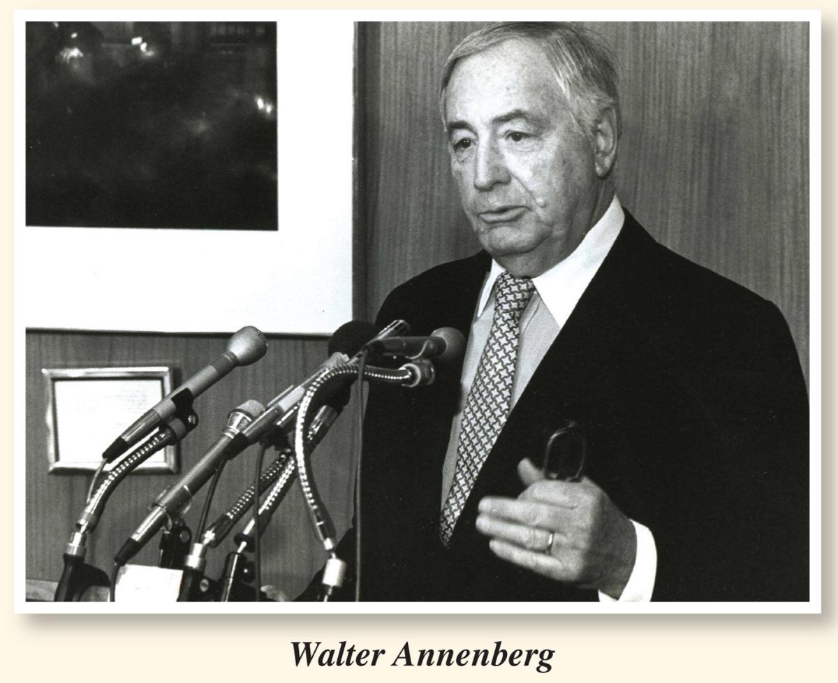 Walter Annenberg (1908-2002) was a publishing magnate in addition to being a philanthropist and a diplomat. Inheriting the Philadelphia Inquirer from his father, he built a publishing empire by creating magazines such as TV Guide and Seventeen in addition to accumulating many radio and television stations. He also served as the U.S. Ambassador to the United Kingdom from 1969-1974. His famous estate in Rancho Mirage, CA hosted countless functions with the top names in entertainment, politics, business, and royalty.