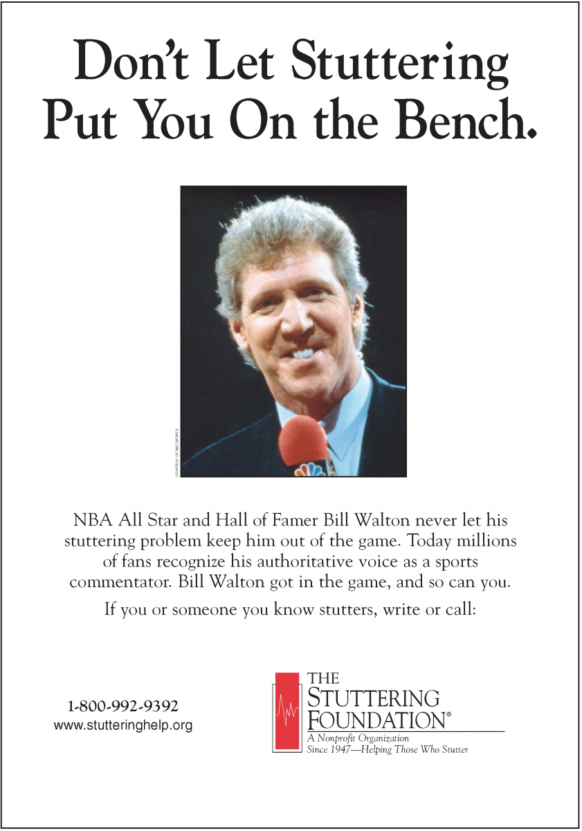 The Stuttering Foundation mourns the passing of college basketball and NBA legend, broadcaster, and stuttering advocate Bill Walton.Featured nearly 30 years ago in The Stuttering Foundation newsletter, Walton spoke about his stuttering through childhood, college, and even in his professional career. Following is excerpted from that article: