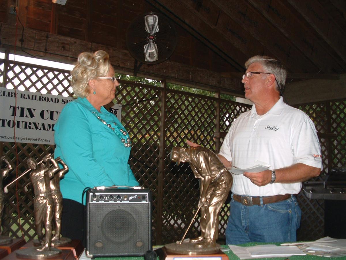Photo caption: Kirk Tarver, vice president of Shelby Railroad, presents a donation to Donna White of the Stuttering Foundation on Sept. 18 at Wedgewood Golf Club. Download picture